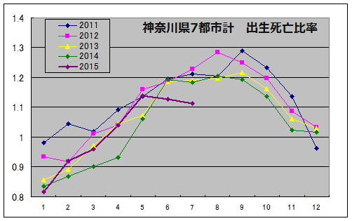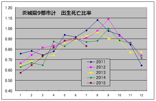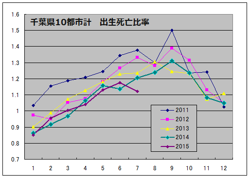 千葉県10都市 出生死亡比率。7月にこんなに低くなったことはない。
