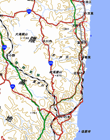 福島第一原発から常磐富岡インター、いわき中央インター経由で、いわき市立総合磐城共立病院まで概算距離約60km。
