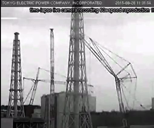 2015/8/26、F1構内で大型クレーンのジブがバランスを崩して倒れている。