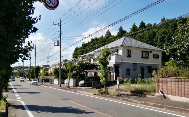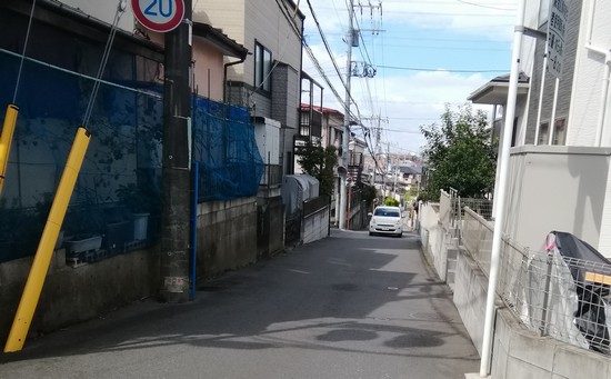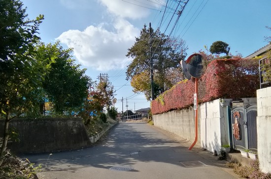 二和向台の駅から歩きだします。駅前を通る広い道は団地の中に通じていてその先は狭い道です。駅前に出てくる道がもう1本あり、狭いカーブした道なのです。これは見物とそちらを通りました。