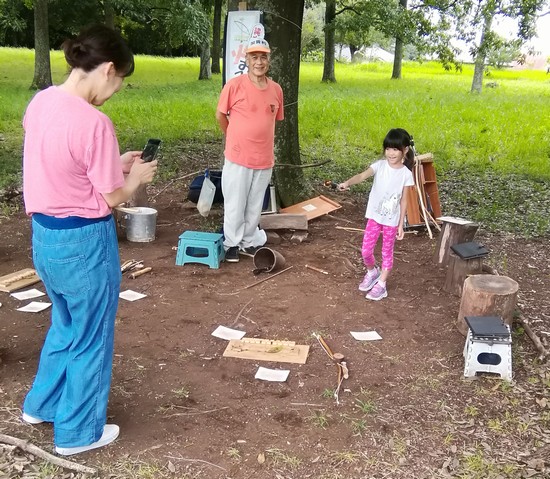 ここでの火おこし器具は、弓のような形の弦の部分に大きな鉛筆状のものが弦をまかれた状態となっており、この弓の両側を二人で持って押し引きすると、鉛筆が回転しますのでその先に突き出ているセイタカアワダチソウの茎を板に開いた穴に突っ込んで摩擦し、種火を起こすのです。