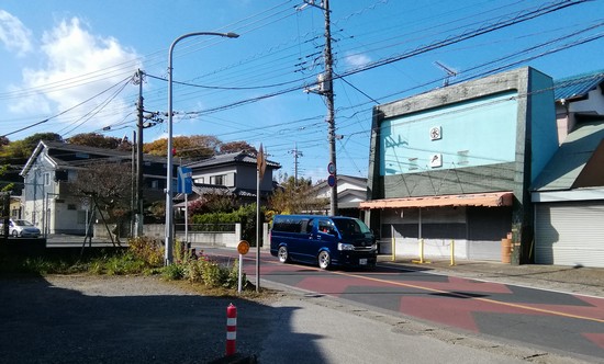 子和清水の湧水跡わきの道路を越えると鮮魚街道が途切れます。ガソリンスタンドと駐車場になっています。