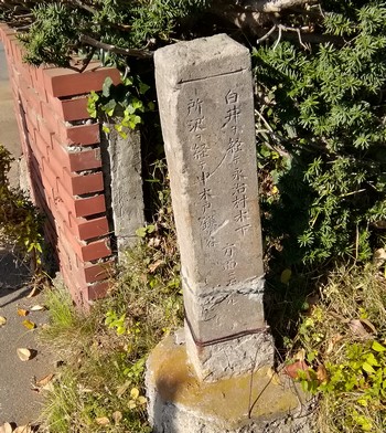 家が途切れたところを右に回るのですが、古い道路標識があります。「白井ヲ経テ英治村木下方面ニ至ル」とあります。先ほど渡った車道が木下街道です。裏道を通る人も多かったのでしょうか。