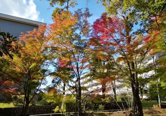 紅葉の見どころは、公園と隣接する団地との間の細い道。