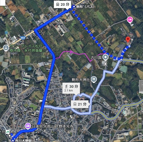 市川大野からここまで私たちは途中から畑の中を通ってきたのですが(ピンクの線)、私たちが動植物園の入口に着いて一服していたら、畑の中の近道に入る直前に私たちを追い越した男女が到着しました。彼らは幹線道路を歩いてきたのです。距離的には2.5倍近いでしょう。でも若ければそれも苦にならない。彼らの歩行スピードは私らの2.5倍なのです。私らの歩行力がどれほど落ちているかわかります。