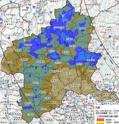 セシウムの沈着蓄積量のマップは、3万ベクレルから6万ベクレルまでが階層区分の一つとなっており、茨城県南部と千葉県の北西部にこの階層に区分される汚染度の地域がある。