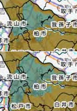 千葉県の測定結果は興味深いものがある。次は、東葛飾地域のセシウム134とセシウム137の沈着量。柏市と流山市の南部と松戸市は、セシウム137に比べて134の沈着量が少ないところがあり、これらの場所は、137、134両方ともに沈着量が多いところに比して空間線量率が低めに出ている。