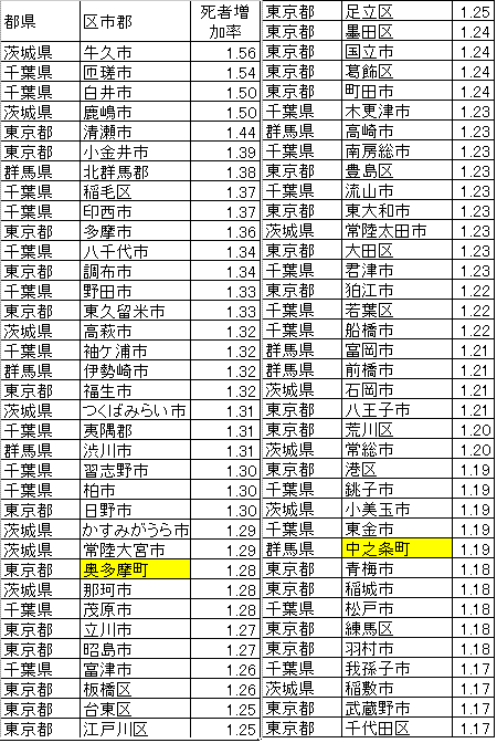 栃木県、さいたま県、神奈川県のデータがないが、それでも関東一円であちこちに死亡者数の伸びの大きい区市郡があることがわかる。なお、東京都は、「都市は人間を自由にする。死ぬも生きるも自分次第。台東区では毎月千人に一人死ぬ」の記事の計算対象期間と異なるので、23区の中では板橋区がトップに来ている。