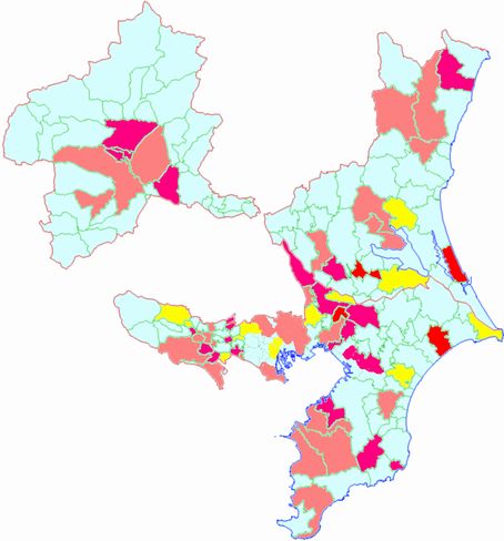 表だけでは分かりにくいので、地図に落としてみた。朱色に近い赤が1.4以上、桃色がかった赤が1.3〜1.4、くすんだ桃色が1.2〜1.3、黄色が1.2以下。1.1台の区市郡は多いが、上の表は適当なところで区切って掲載している。