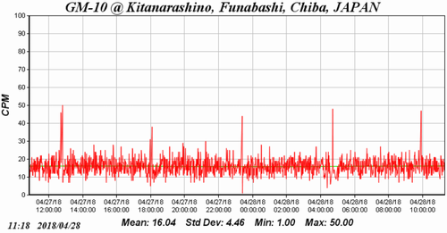 次のグラフは、個人が千葉県船橋市習志野台 鉄筋コンクリート造 集合住宅 5偕 に設置した放射能測定器GM10のグラフです。
