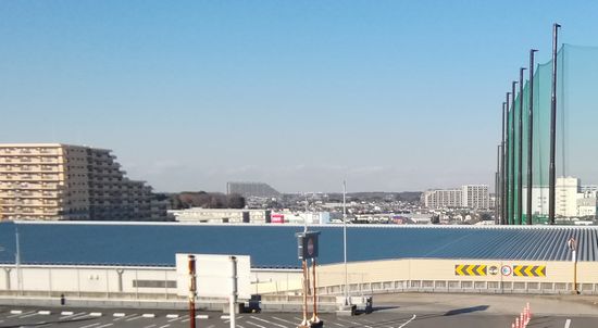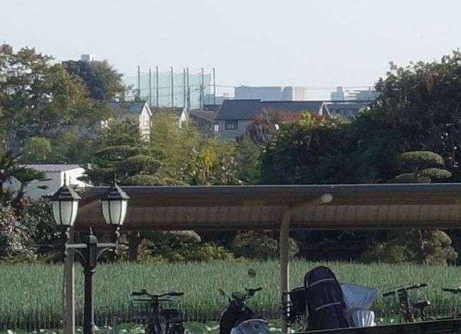 まず手に持っていたdtabのスマホで写真を撮影。画面を見るとゴルフ練習場の柱とともに何か建物が写っています。次の画像は、スマホの元画像から横幅680ピクセルで切り出したものです。それ以外の加工は加えていません。