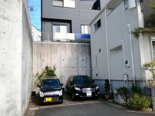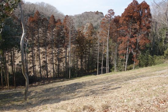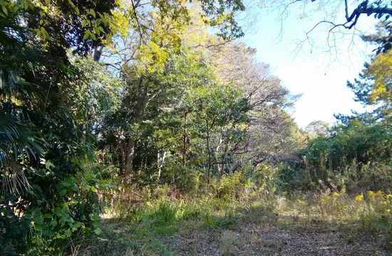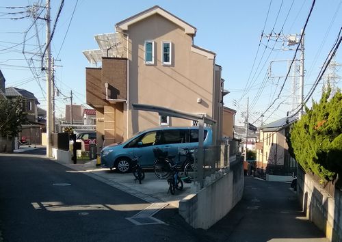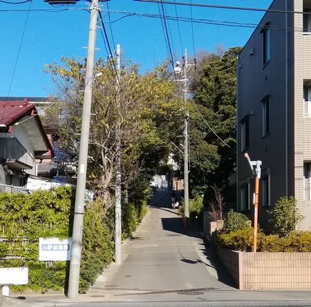 上の画像のところから少し歩くと団地の端に入り、駐車場があります。団地開発前は後ろに見えるような林がこの一帯を覆っていたのです。