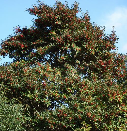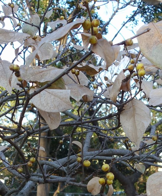 この木を通りすがりに横目で見ると、何か実がついています。この木のあることはそれこそ10年前から知っています。まだ若木でした。