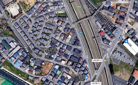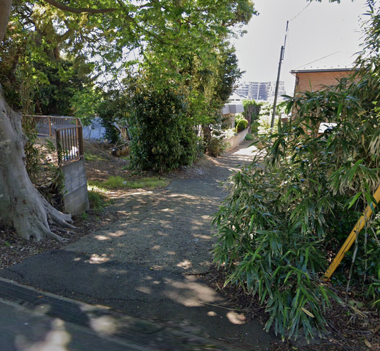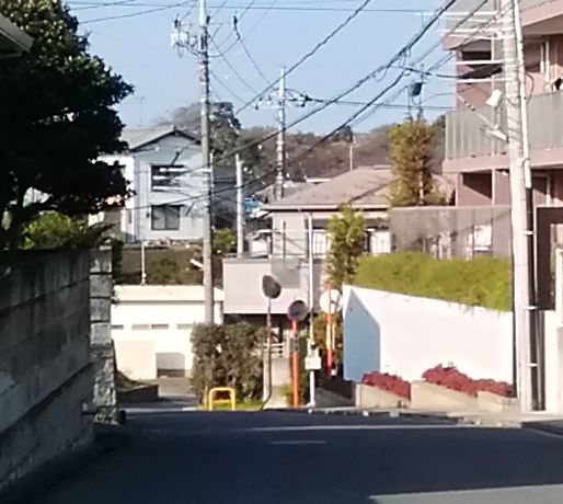 今日は写真撮影で面白いことがありました。この地域で最も高い場所を歩いていたら、下り坂の脇道から南の方角が遠望できました。遠くに何か見えています。(この画像はGoogle Streetviewから取りました)