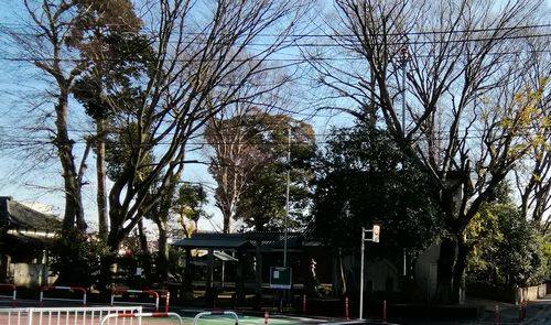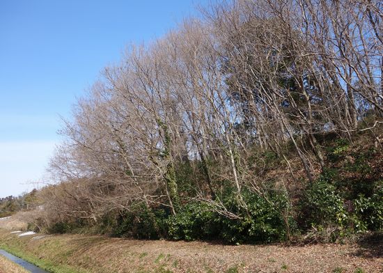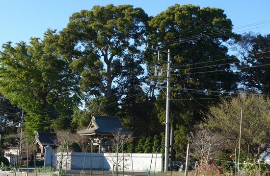 塚田小学校の西側道路から北を見ています。林の中に神明神社があります。