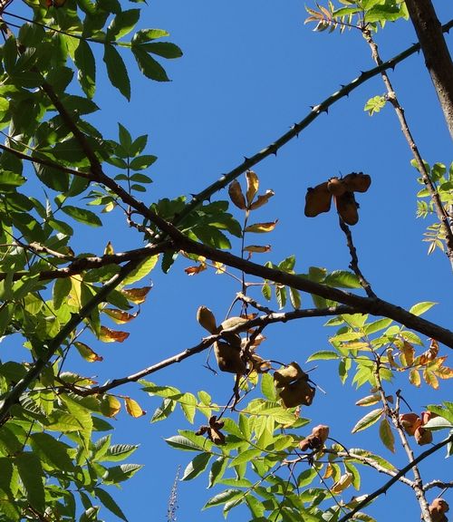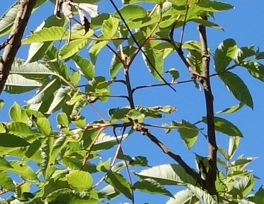 歩き出してすぐ、羽状複葉の木に何か実がついていました。鳥の羽のような葉の木には、ウルシがありますので安易に触るのは禁物です。ハゼの仲間にかぶれる人もいます。ウルシの仲間の実はこのようにはなりませんから、かぶれはまず大丈夫と判断して、実を採取しました。