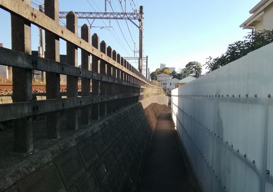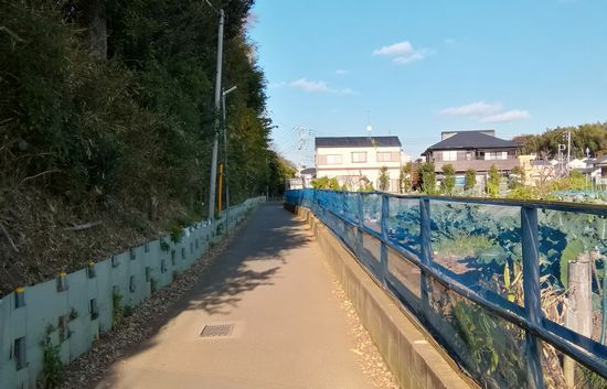 船橋市は東庄町に障碍者施設も運営しています。障害を持った人のおられる家族には、住みやすいのかもしれませんが、詳しいところはわかりません。ただ、自治体によって障害のある方に対する支援の程度は大きく異なり、それに注目して転居する例も多いと聞いています。左手が登坂の斜面になっており、この斜面に護岸を作って住宅が建設されています。ここにお住いの男性に伺ったらもう35年程度前から住んでいるとのことですからこんな風に開発されたのはずいぶん早いんですね。