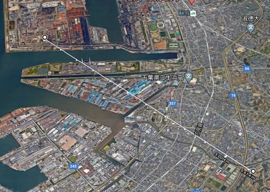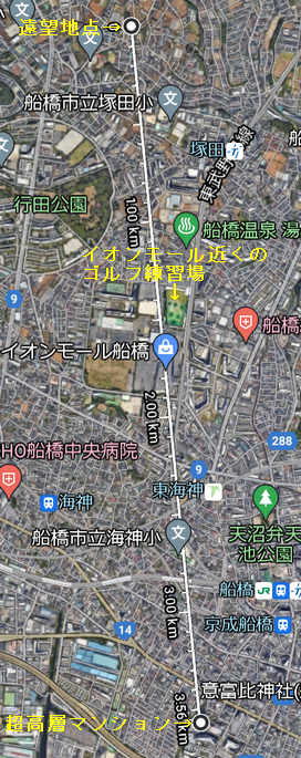 そもそもこの建物は何でしょう。撮影地点とイオンモール近くのゴルフ練習場を地図上で結び、延長すると船橋市役所近くの超高層マンションに当たりました。