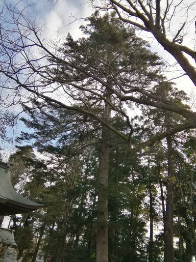 神社の本殿の前にある針葉樹。これも大きい。下のほうに葉がないのでなんの木かわかりません。