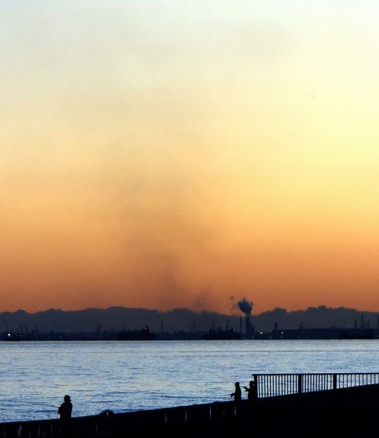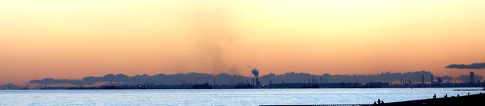 高台から眺めると遠くに黒い煙が広がっています。