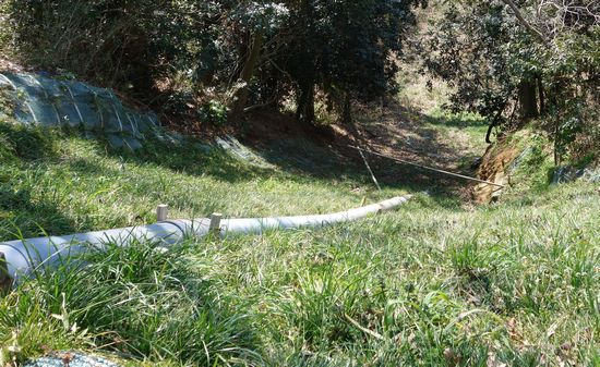 細い道のがけ崩れ現場の復旧工事が一応終わっていました。こんなに急です。覗き込むだけで怖い。私が落ちたら確実に死ぬ。(そんな危険なことしなきゃいいのに)